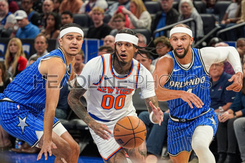 Orlando, Florida, USA, November 22, 2025, New York Knicks guard Jordan Clarkson #00 run pass Anthony Black #0 and Jalen Suggs #4 at the Kia Center. (Photo Credit: Marty Jean-Louis)