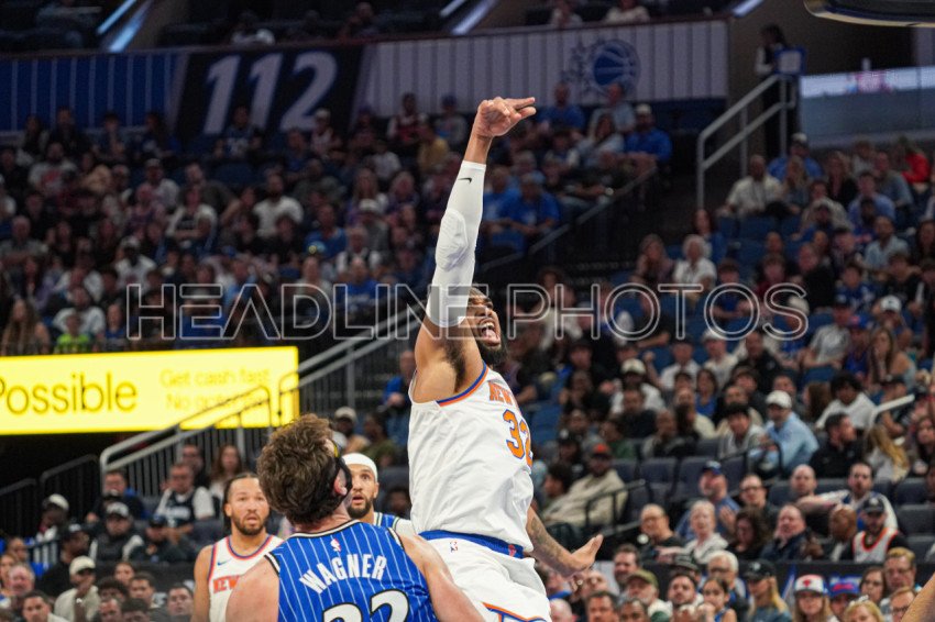 Orlando, Florida, USA, November 22, 2025, New York Knicks forward Karl-Anthony Towns #32 attempt to score at the Kia Center. (Photo Credit: Marty Jean-Louis)