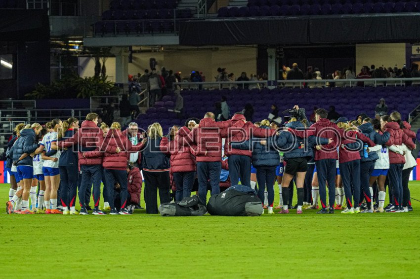 Orlando, USA, November 28, 2025, U.S. National Women's Team players and coaches huddle after the match at Inter&Co Stadium. (Photo Credit: Marty Jean-Louis)