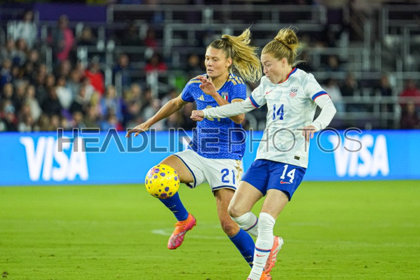 Orlando, USA, November 28, 2025, Italy's Women National Team player Michela Cambiaghi #21 and the U.S. National Women's Team player Emily Sonnett #14 fight the for ball at Inter&Co Stadium. (Photo Credit: Marty Jean-Louis)