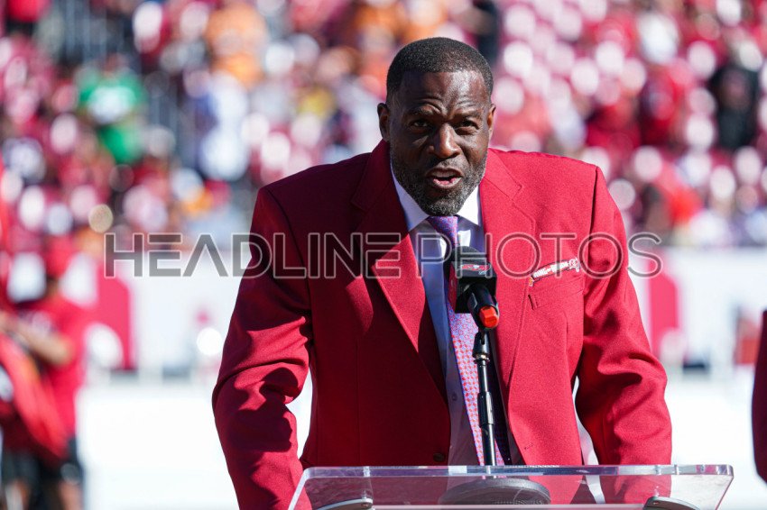 Tampa Bay, Florida, USA, November 30, 2025, former Tampa Bay Buccaneers player Simeon Rice being inducted into the ring of honor at Raymond James Stadium. (Photo Credit: Marty Jean-Louis)