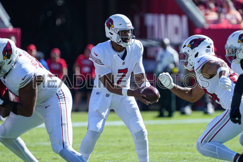 Tampa Bay, Florida, USA, November 30, 2025, Arizona Cardinals quarterback Jacoby Brissett #7 makes a pass to Elijah Higgins #84 at Raymond James Stadium. (Photo Credit: Marty Jean-Louis)