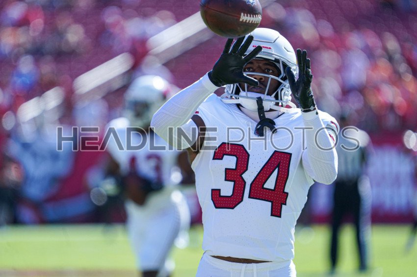 Tampa Bay, Florida, USA, November 30, 2025, Arizona Cardinals safety Jalen Thompson #34 warming up at Raymond James Stadium. (Photo Credit: Marty Jean-Louis)