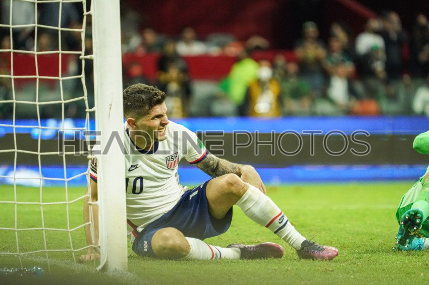 Mexico City, Mexico, March 24, 2022, USA forward Christian Pulisic #10 in pain after running in to Mexican Goalkeeper in the 2022 World Cup Qualifier at Allianz Field. (Photo Credit: Marty Jean-Louis)