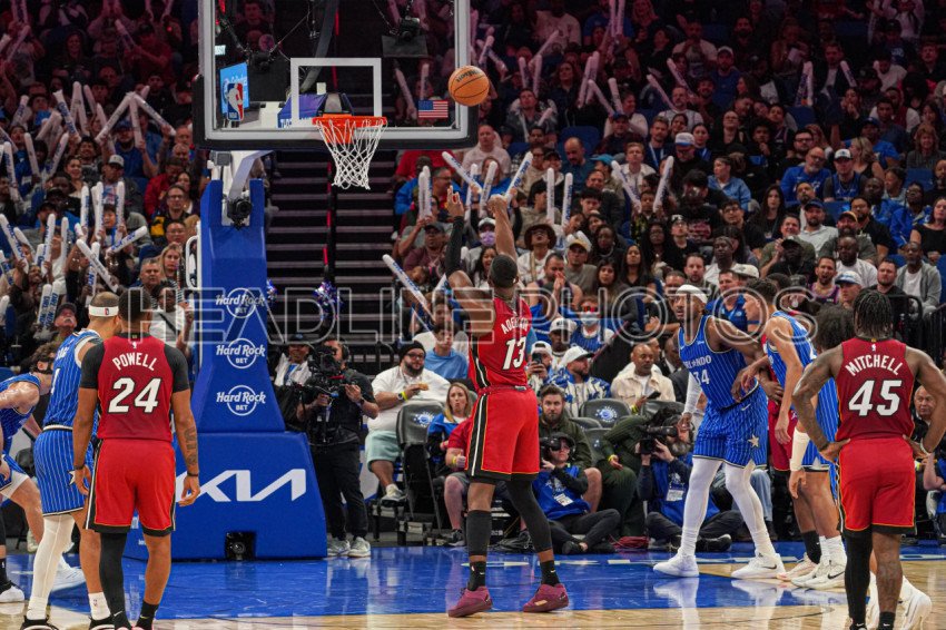 Orlando, Florida, USA, December 5, 2025, Miami Heat player Bam Adebayo #13 shoots a technical at the Kia Center. (Photo Credit: Marty Jean-Louis)