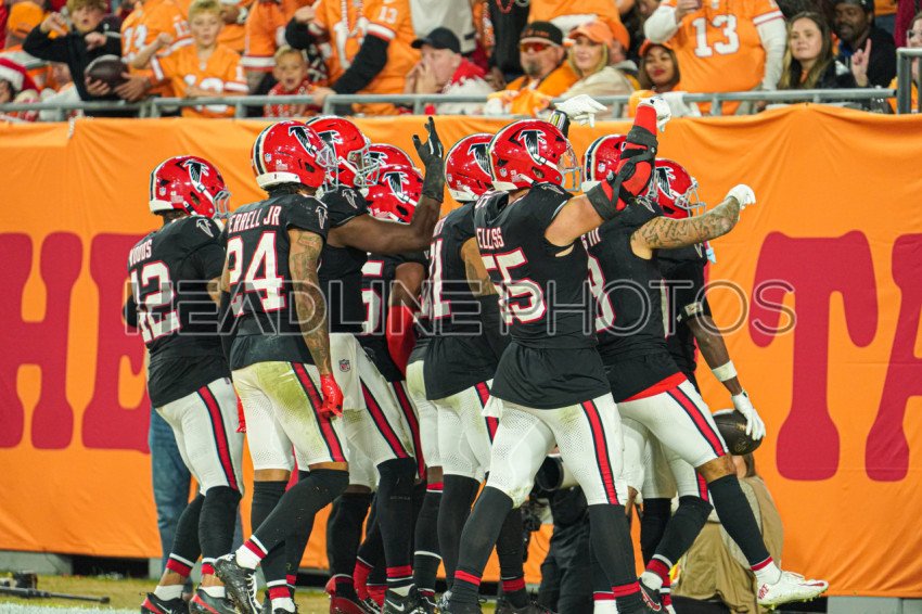 Tampa Bay, Florida, USA, December 11, 2025, Atlanta Falcons players celebrate a play at Raymond James Stadium. (Photo Credit: Marty Jean-Louis)