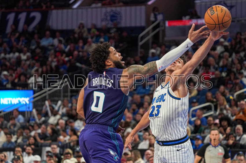 Orlando, Florida, USA, December 26, 2025, Charlotte Hornets forward Miles Bridges #0 attempt to score but is blocked by Tristan da Silva #23 at the Kia Center. (Photo Credit: Marty Jean-Louis)