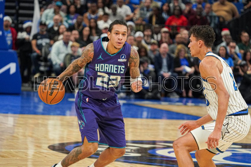 Orlando, Florida, USA, December 26, 2025, Charlotte Hornets guard Tre Mann #23 rushes forward at the Kia Center. (Photo Credit: Marty Jean-Louis)