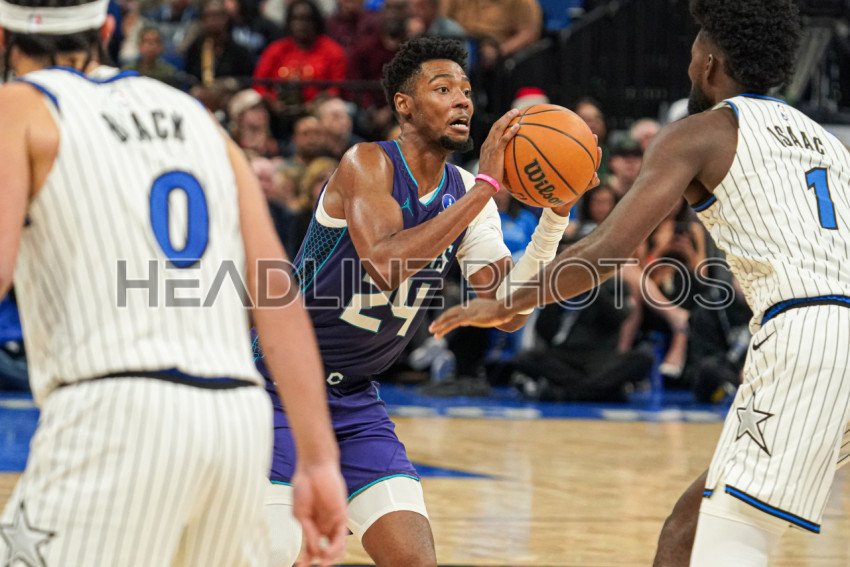 Orlando, Florida, USA, December 26, 2025, Charlotte Hornets guard Brandon Miller #24 looking to make a pass at the Kia Center. (Photo Credit: Marty Jean-Louis)
