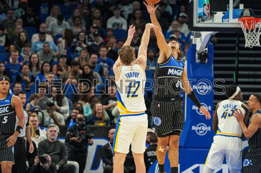 Orlando, Florida, USA, January 4, 2026, Indiana Pacers forward Johnny Furphy #12 shoots a three and Anthony Black #0 makes a block at the Kia Center. (Photo Credit: Marty Jean-Louis)