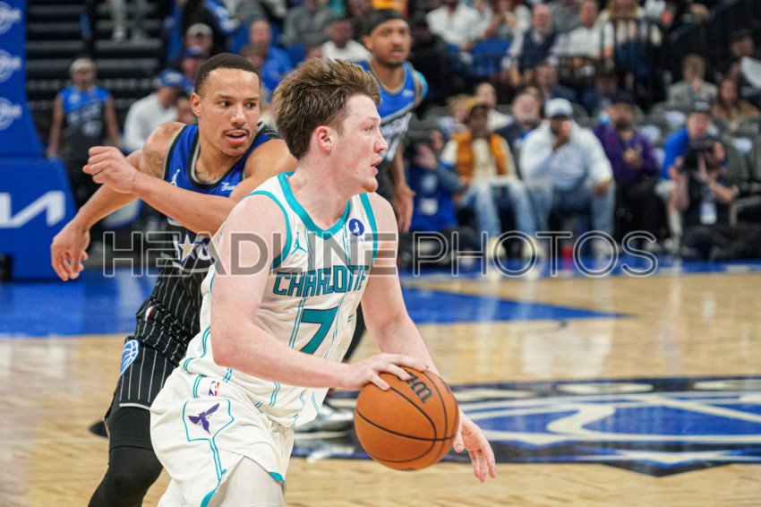 Orlando, Florida, USA, January 23, 2026, Charlotte Hornets forward Kon Knueppel #7 rushes forward at the Kia Center. (Photo Credit: Marty Jean-Louis)