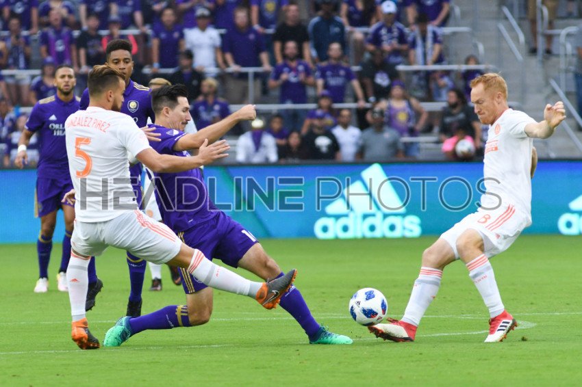 Orlando City Captain S. Kljestan attempts to steal the all from L. Gonzalez Perez and E Barco. Photo Credit: Marty Jean-Louis