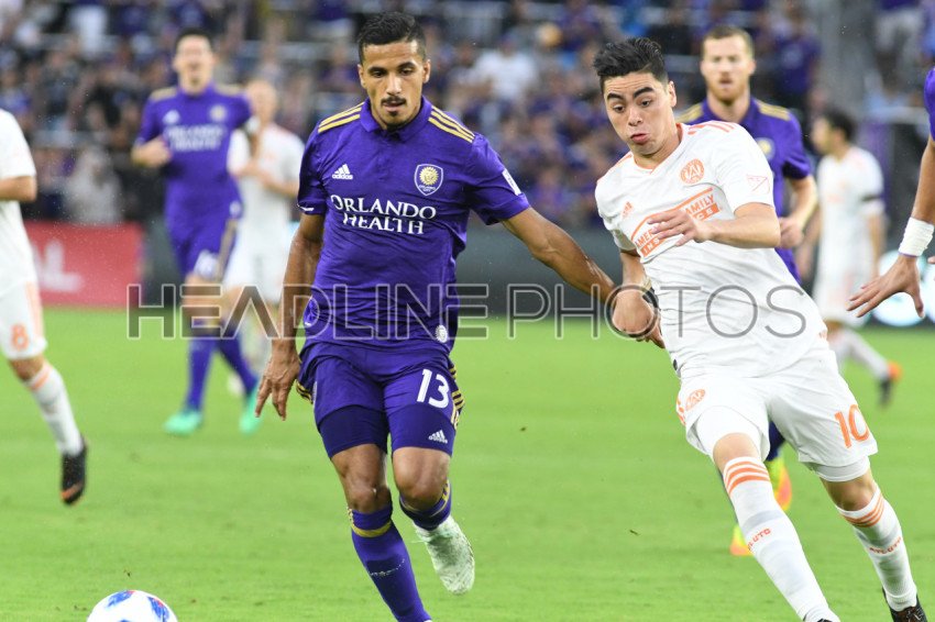 Orlando City's Mohamed El-Munir and Atlanta's M. Almiron fight for the all. Photo Credit: Marty Jean-Louis