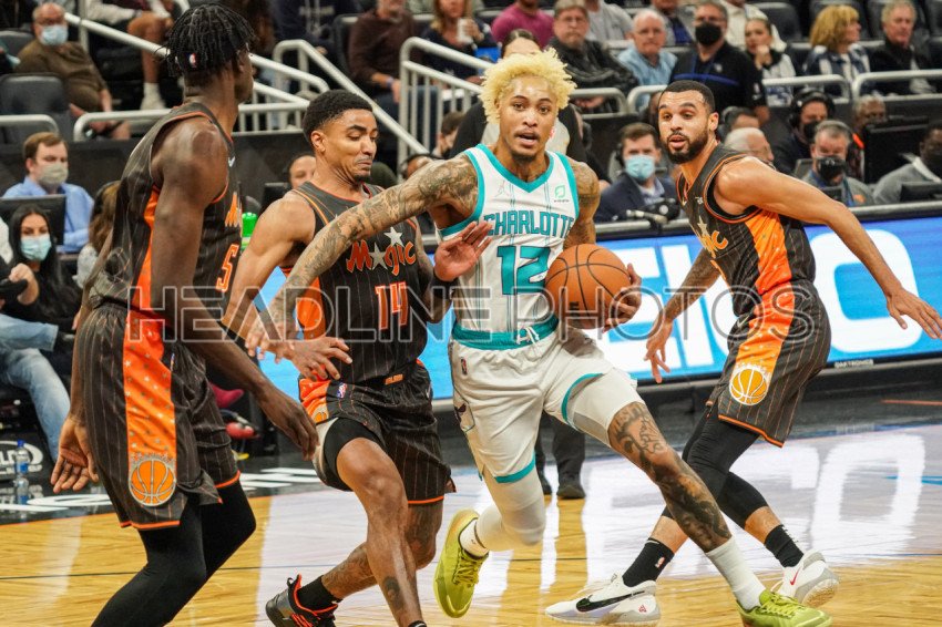 Orlando, Florida, USA, November 24, 2021, Charlotte Hornests guard Kelly Oubre Jr. #12 attempt to break pass Orlando players Gary arris #14 and Mo Bamba #5 during the second quarter at the Amway Center. (Photo Credit: Marty Jean-Louis)