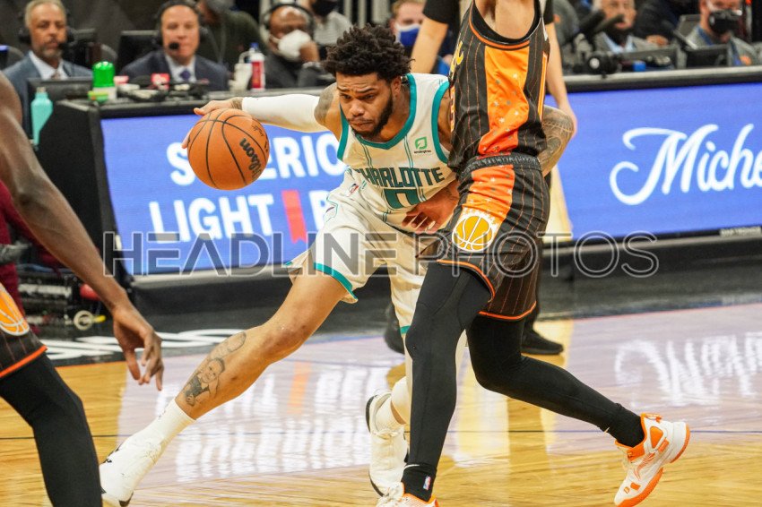Orlando, Florida, USA, November 24, 2021, Charlotte Hornests forward Miles Bridges #0 attempt to run pass Orlando's defence at the Amway Center. (Photo Credit: Marty Jean-Louis)