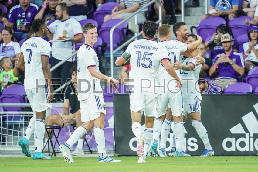 Orlando, Florida, USA, July 4, 2022, DC United players celebrate goal against Orlando City SC at Exploria Stadium. (Photo Credit: Marty Jean-Louis)