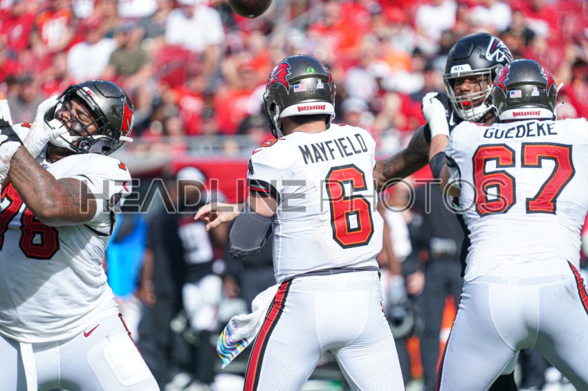 Tampa Bay, Florida, USA, October 22, 2023, Tampa Bay Buccaneers quarterback Baker Mayfield #6 makes a pass at Raymond James Stadium. (Photo Credit: Marty Jean-Louis)