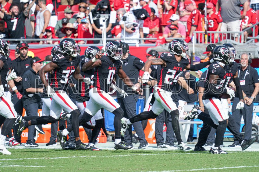 Tampa Bay, Florida, USA, October 22, 2023, Atlanta Falcons players celebrating at Raymond James Stadium. (Photo Credit: Marty Jean-Louis)