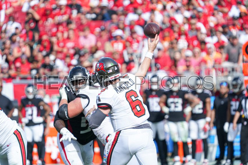 Tampa Bay, Florida, USA, October 22, 2023, Tampa Bay Buccaneers quarterback Baker Mayfield #6 makes a pass at Raymond James Stadium. (Photo Credit: Marty Jean-Louis)