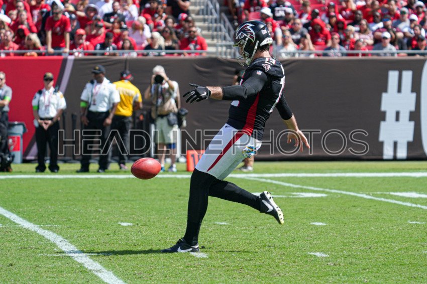 Tampa Bay, Florida, USA, October 22, 2023, Atlanta Falcons punter Bradley Pinion #13 makes a kick at Raymond James Stadium. (Photo Credit: Marty Jean-Louis)
