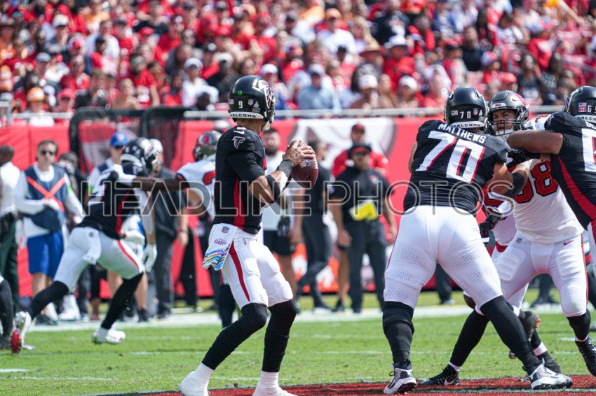 Tampa Bay, Florida, USA, October 22, 2023, Atlanta Falcons quarterback Desmond Ridder #9 look to make a pass at Raymond James Stadium. (Photo Credit: Marty Jean-Louis)