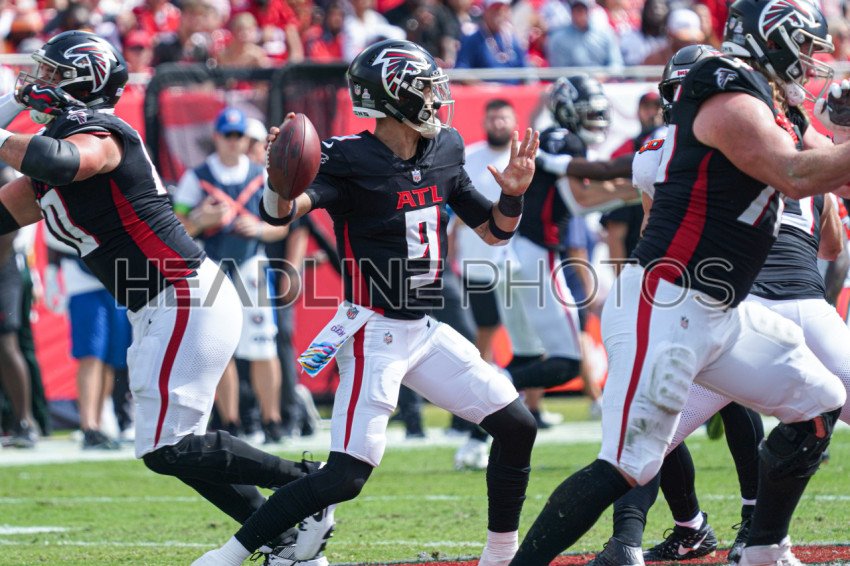 Tampa Bay, Florida, USA, October 22, 2023, Atlanta Falcons quarterback Desmond Ridder #9 look to make a pass at Raymond James Stadium. (Photo Credit: Marty Jean-Louis)