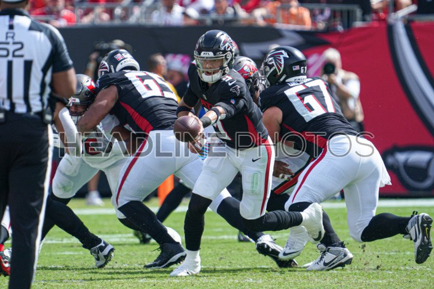 Tampa Bay, Florida, USA, October 22, 2023, Atlanta Falcons quarterback Desmond Ridder #9 makes a pass at Raymond James Stadium. (Photo Credit: Marty Jean-Louis)