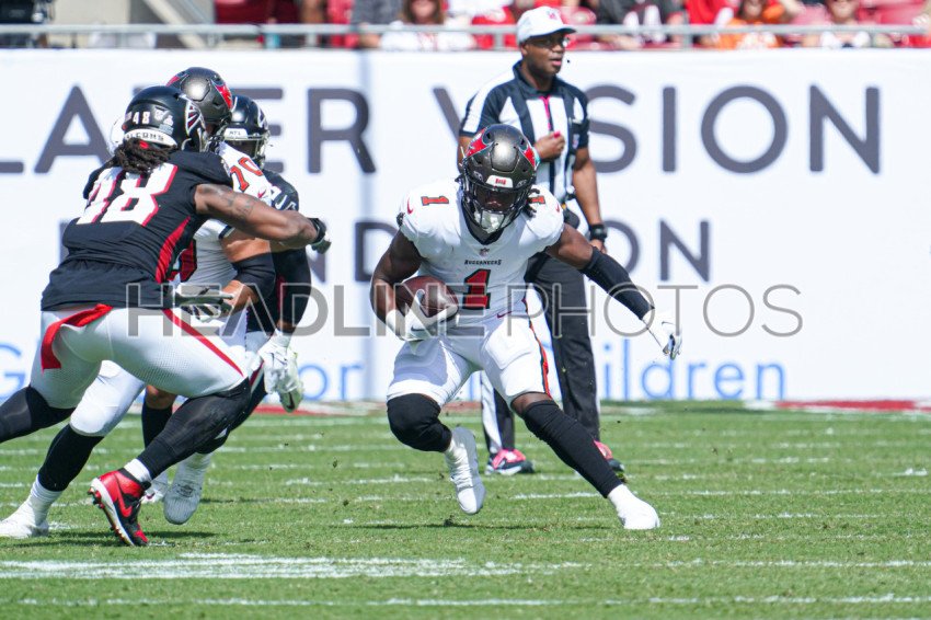 Tampa Bay, Florida, USA, October 22, 2023, Tampa Bay Buccaneers Running back Rachaad White #1 makes a run in the first half at Raymond James Stadium. (Photo Credit: Marty Jean-Louis)