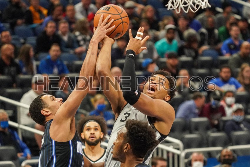 Orlando, Florida, USA, November 5, 2021, San Antonio Spurs Forward Keldon Johnson #3 attempt to make a basket but is blocked by Orlando Magic's Jalen Suggs #4 at the Amway Center. (Photo Credit: Marty Jean-Louis)