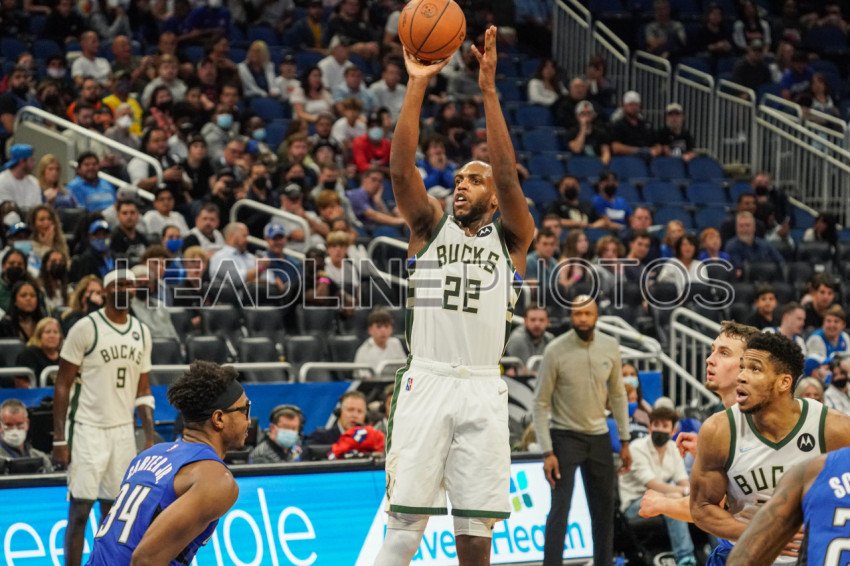 Orlando, Florida, USA, December 30, 2021, Milwaukee Bucks forward Khris Middleton #22 shoots a three point at the Amway Center. (Photo Credit: Marty Jean-Louis)