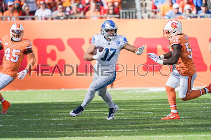 Tampa Bay, Florida, USA, October 15, 2023, Detroit Lions Sam LaPorta #87 makes a run in the first quarter at Raymond James Stadium. (Photo Credit: Marty Jean-Louis)