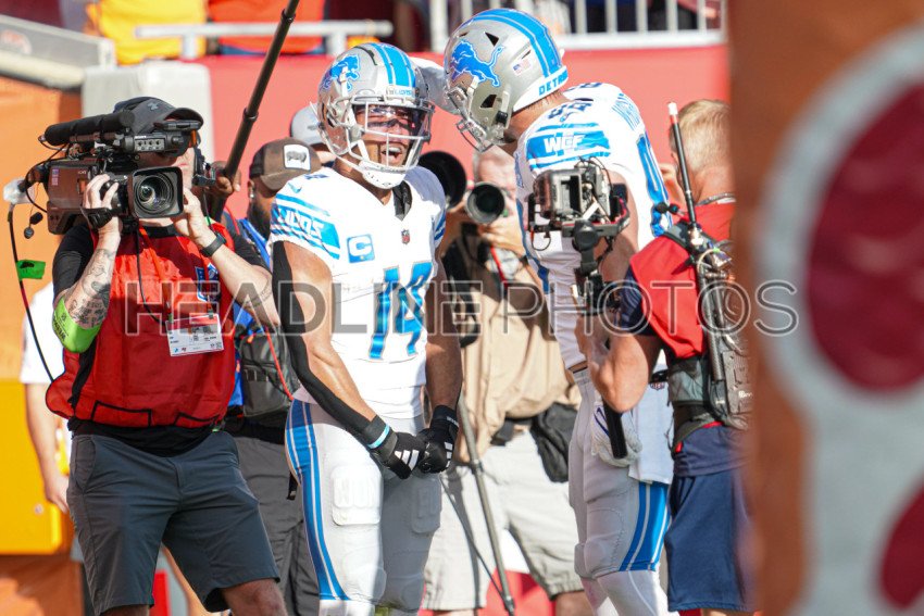 Tampa Bay, Florida, USA, October 15, 2023, Detroit Lions Wide Receiver Amon-Ra St. Brown #14 celebrat after making a touch down at Raymond James Stadium. (Photo Credit: Marty Jean-Louis)