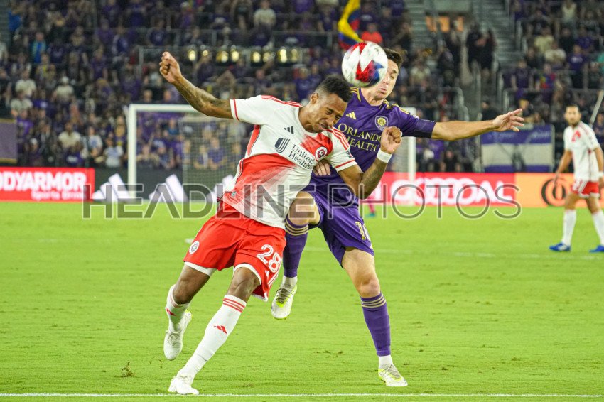 Orlando, Florida, USA, October 7, 2023, New England Revolution Midfielder Mark-Anthony Kaye #28 wins the header in the first half at Exploria Stadium. (Photo Credit: Marty Jean-Louis)