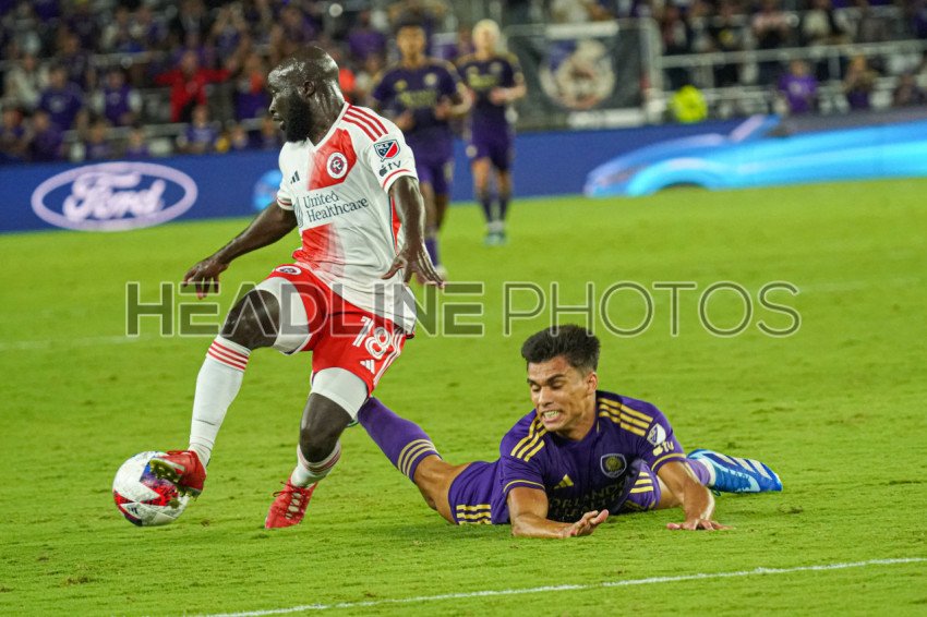 Orlando, Florida, USA, October 7, 2023, New England Revolution player Emmanuel Boateng #18 steals the ball in the second half at Exploria Stadium. (Photo Credit: Marty Jean-Louis)