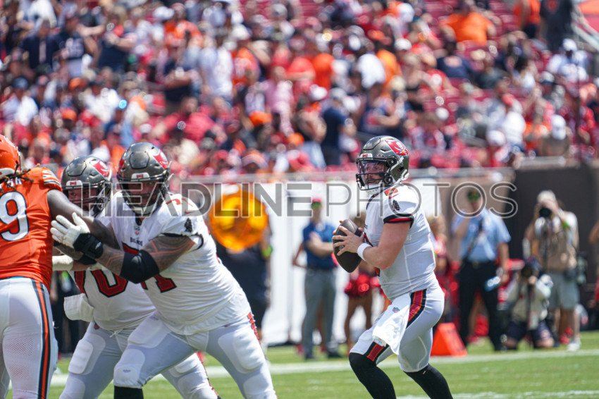 Tampa Bay, Florida, USA, September 17, 2023, Tampa Bay Buccaneers quarterback Baker Mayfield #6 look to make a pass at Raymond James Stadium. (Photo Credit: Marty Jean-Louis)