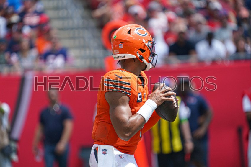 Tampa Bay, Florida, USA, September 17, 2023, Chicago Bears quarterback Justin Fields #1 looks to make a pass at Raymond James Stadium. (Photo Credit: Marty Jean-Louis)