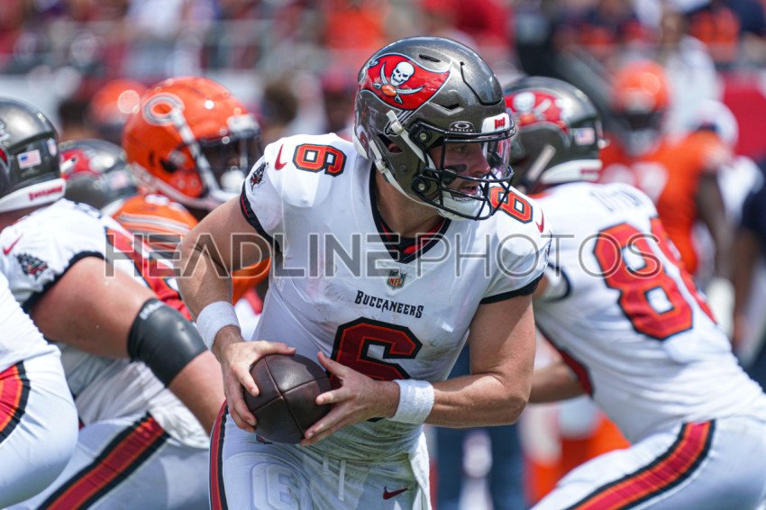 Tampa Bay, Florida, USA, September 17, 2023, Tampa Bay Buccaneers quarterback Baker Mayfield #6 readies to pass the ball at Raymond James Stadium. (Photo Credit: Marty Jean-Louis)