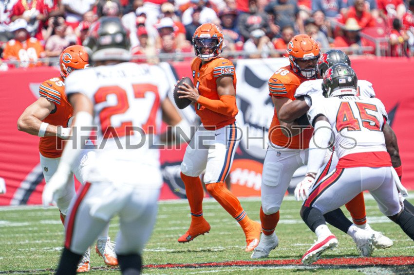Tampa Bay, Florida, USA, September 17, 2023, Chicago Bears quaterback Justin Fields #1 looks to make a pass at Raymond James Stadium. (Photo Credit: Marty Jean-Louis)
