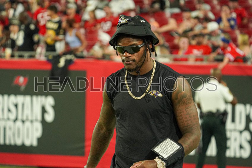 Tampa Bay, Florida, USA, August 26, 2023, Baltimore Ravens quarterback Lamar Jackson at Raymond James Stadium. (Photo Credit: Marty Jean-Louis)