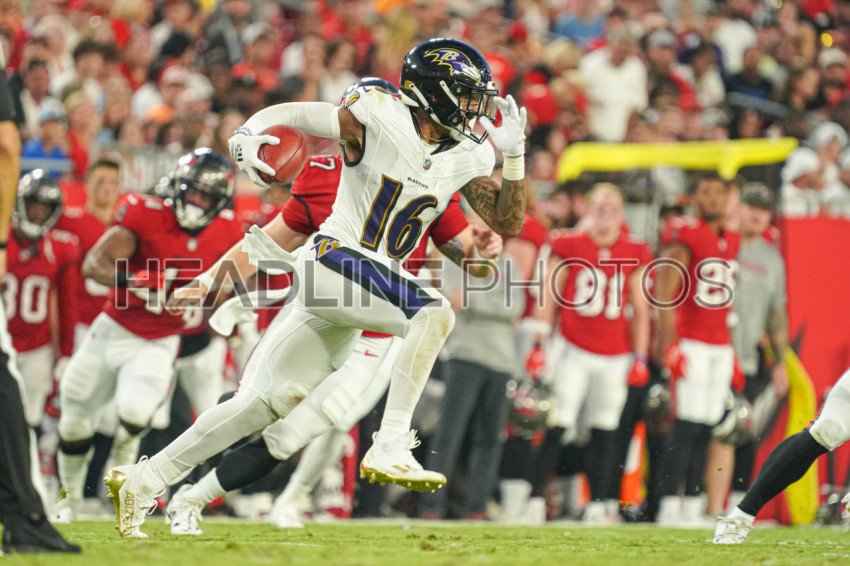 Tampa Bay, Florida, USA, August 26, 2023, Baltimore Ravens Wide Receiver Tylan Wallace #16 makes a run at Raymond James Stadium. (Photo Credit: Marty Jean-Louis)