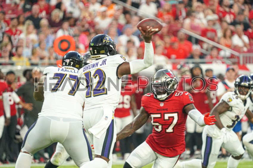 Tampa Bay, Florida, USA, August 26, 2023, Baltimore Ravens quarterback Anthony Brown #12 makes a pass at Raymond James Stadium. (Photo Credit: Marty Jean-Louis)