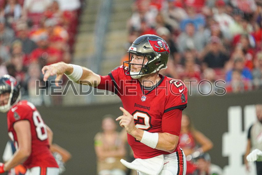 Tampa Bay, Florida, USA, August 26, 2023, Tampa Bay Buccaneers quarterback Kyle Trask #2 makes a pass at Raymond James Stadium. (Photo Credit: Marty Jean-Louis)