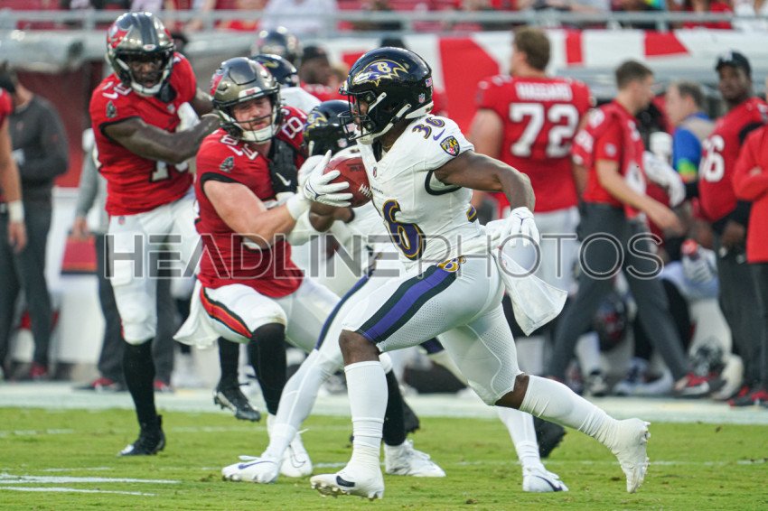 Tampa Bay, Florida, USA, August 26, 2023, Baltimore Ravens Runningback Owen Wright #36 makes a run at Raymond James Stadium. (Photo Credit: Marty Jean-Louis)