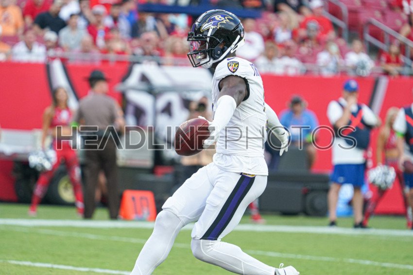 Tampa Bay, Florida, USA, August 26, 2023, Baltimore Ravens Cornerback Jalyn Armour-Davis #5 makes a touch down in the first at Raymond James Stadium. (Photo Credit: Marty Jean-Louis)