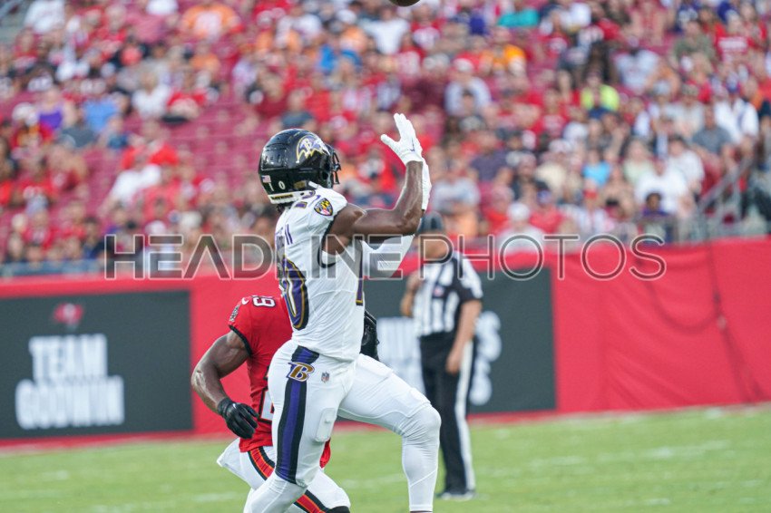 Tampa Bay, Florida, USA, August 26, 2023, Baltimore Ravens Wide Receiver James Proche II #10 makes a catch in the first at Raymond James Stadium. (Photo Credit: Marty Jean-Louis)