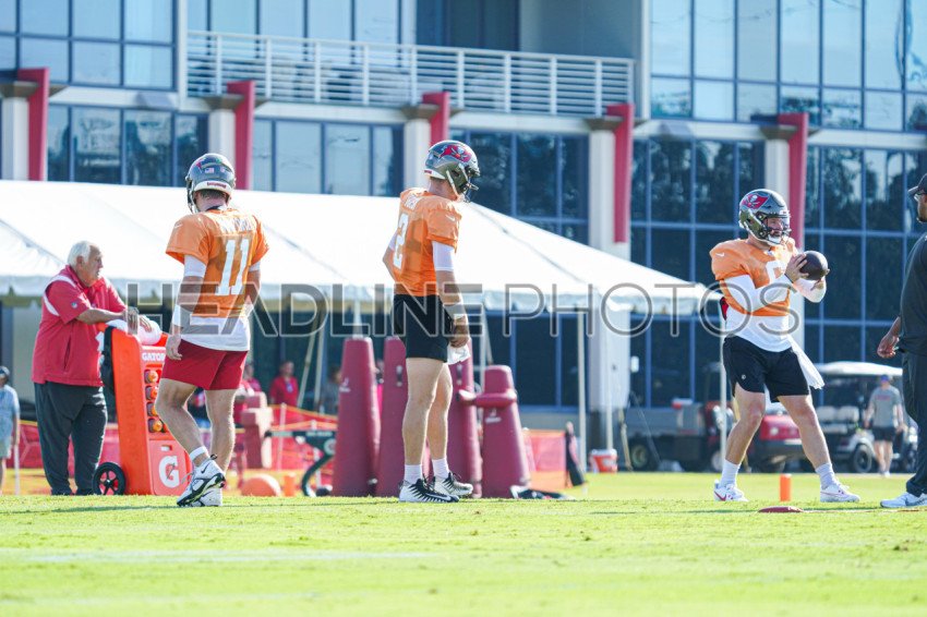 Tampa, Florida, USA, August 3, 2023, Tampa Bay Buccaneers quarterbacks Kyle Trask #2, Baker Mayfield #6 and John Wolford #11 during a Training Camp at Advent Health Training Center . (Photo Credit: Marty Jean-Louis)
