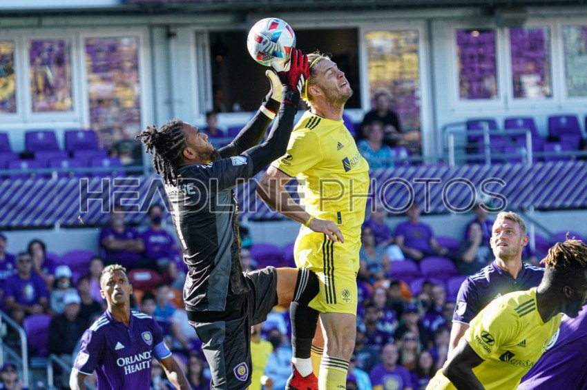 Orlando, Florida, USA, October 31, 2021, Orlando City Goalkeeper Pedro Gallese #1 makes a save as Walker Zimmerman attempt a header at Exploria Stadium (Photo Credit: Marty Jean-Louis)