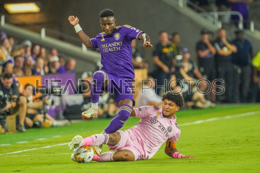 Orlando, Florida, USA, September 24, 2023, Orlando City SC forward Ivan Angulo #77 jumps to avoid tackle from DeAndre Yedlin #2 at Exploria Stadium. (Photo Credit: Marty Jean-Louis)