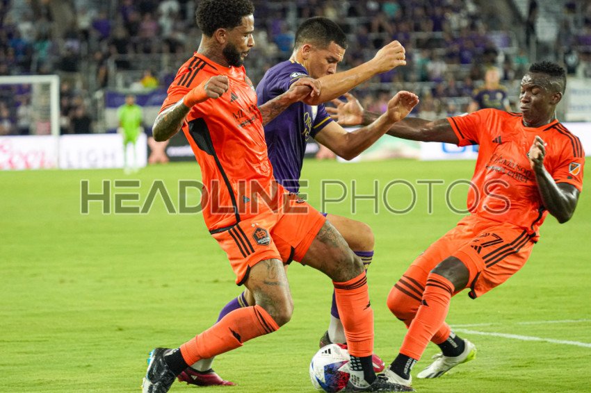 Orlando, Florida, USA, July 21, 2023, Orlando City SC Midfielder César Araujo #5 attempt to run through Houston Dynamo players at Exploria Stadium. (Photo Credit: Marty Jean-Louis)