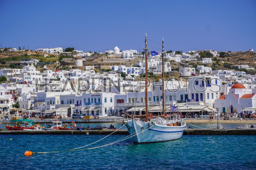 greece greek island mykonos best places in europe blue water boat boating homes mountain painting picturesque summer top places to visit tourists travel vacation water whiteSimilar Photos